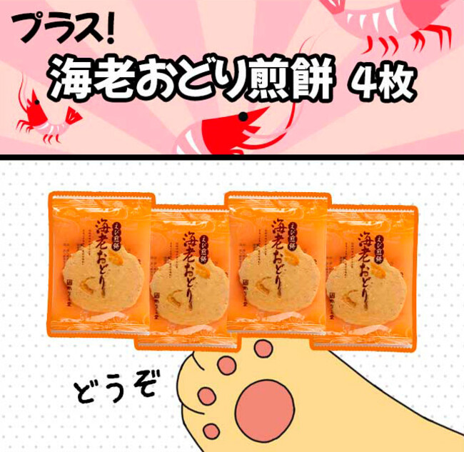またキャラせんべいに使用しているのは、かなん堂の人気商品「海老おどり」です。