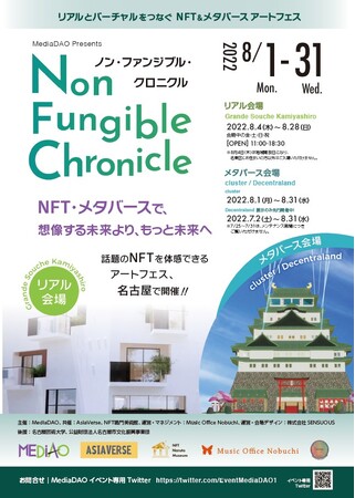 MediaDAOでは、2022年8月、名古屋市名東区に所在する音楽マンション『グランドスーシュ上社』にて、当時最大級規模となるNFTアートのリアルイベント「Non Fungible Chronicle(ノン ファンジブル クロニクル)」を開催しました。