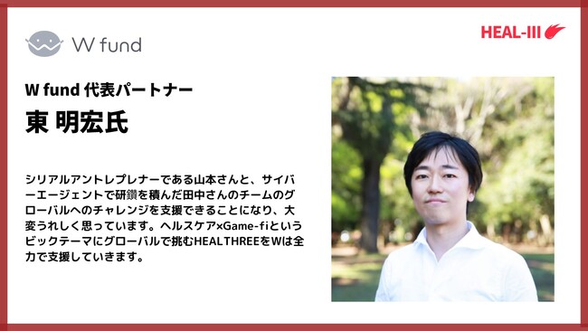 今回の資金調達により、「HEALTHREE」を基盤とした経済圏の構築における、基盤ゲームの実装及びMissionやStore機能の拡充、またトークンの上場や上場後のサステナブルな成長における体制構築を行います。