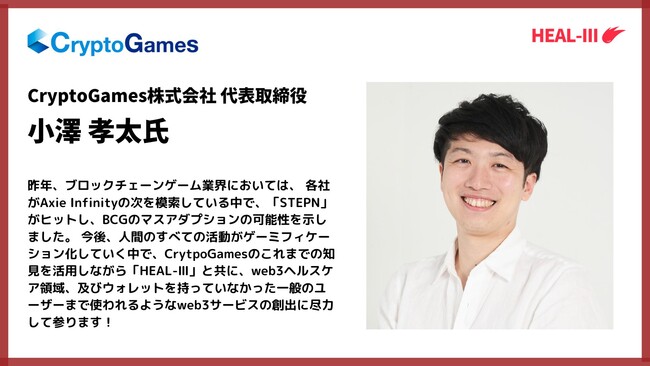 HEALTHREE社は2022年に創業し、Polkadot及びAstar初のヘルスケアブロックチェーンゲーム「HEALTHREE(ヘルスリー)」を運営しています。HEALTHREEをより多くの方にご利用いただくためにも、親和性の高い事業者との業務提携を積極的に進めて参ります。