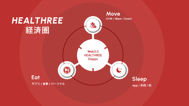 当社の描く「HEALTHREE経済圏」では、ユーザーが健康的な活動を行うことでトークンを獲得し、そのトークンを元にゲームイベントを企画したりするなど、様々な経済活動を行うことで我々のトークンを基軸にした経済圏を構築する事を目指しています。