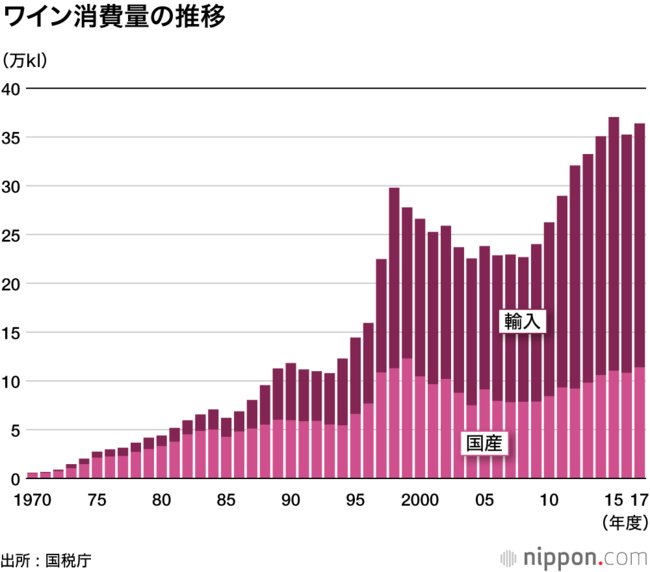 酒類製造販売メーカーの大手、メルシャンが財務省関税局や国税庁などの発表に基づいてまとめたワイン統計によると、2020年度の国内消費量は34万7710キロリットルであった。コロナ禍の影響で前年比1.4%減少したものの、2010年比では約1.3倍と増加し、1980年から40年で市場は約8倍に拡大しています。