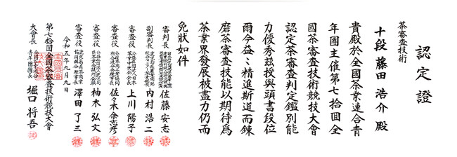 その結果をもとに授与されるお茶の審査鑑定技術の最高位が「茶師十段」。茶師十段の取得は茶業界でも非常に難しく、現在「茶師十段」に認定されているのは、約70年の歴史において23名のみ。本当に優れたお茶の鑑別能力を持つ者だけに与えられる称号と言えます。
