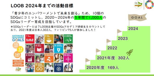 LOOBは現在、10個のSDGsにコミットし、2020~2024年の5年間で1,000人のSDGsリーダーを育成する目標の真っただ中にいます。特に、SDGs目標 4.7『教育を通じた持続可能な開発の促進』を重視し、グローバル・シティズンシップの構築を目指しています。さらに2025年~2030年までの5年間で1,000人のSDGsリーダーを育成する予定です。