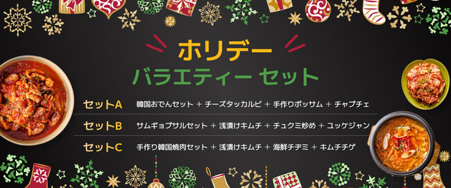 セットはA、B、Cの3種類あり、「韓国おでんセット」「サムギョプサルセット」「手作り焼肉セット」から選べます。クリスマス、年末年始で集まったご家族や友人たちと一緒に本場韓国の味をお楽しみください。