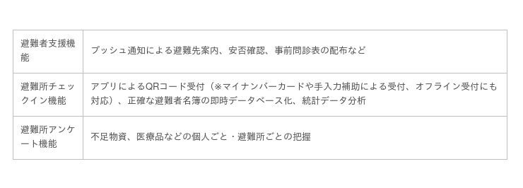 マイナンバーカードを用いたデジタル身分証アプリであることを活かして、災害時における避難先通知・個人別状況把握・名簿管理などを一本化できることが特徴です。
