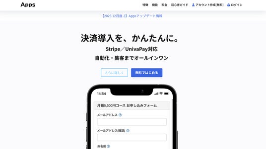 決済導入支援ツール「Apps」は、「個人が簡単に事業をデジタル化できるクラウド型のビジネスアプリケーション。」というビジョンのもと、スモールビジネスの収益化を支援いたします。