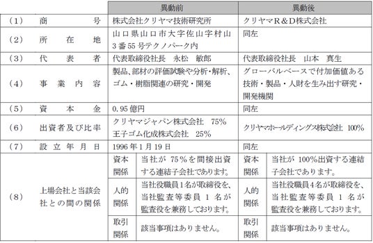 当社は、本年1月1日付けで、連結子会社であるクリヤマジャパン株式会社及び持分法適用関連会社である王子ゴム化成株式会社より、孫会社(連結対象)である株式会社クリヤマ技術研究所(以下「(株)クリヤマ技術研究所」)の全株式を取得し、社名をクリヤマR&D株式会社に変更のうえ、「グローバルベースで付加価値 ある技術・製品・人財を生み出す研究・開発機関」として再編致しましたのでお知らせいたします。