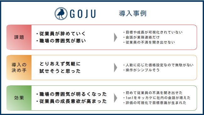 GOJU株式会社(ゴジュウ、本社:東京都千代田区、代表取締役:佐々木健利、以下「GOJU」)は、どんな規模でも無駄なく使える『GOJU -1on1・人事評価 -』をリリースしたことをお知らせします。
