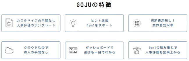 GOJUは、圧倒的に”簡単に”1on1ができ、”手間なく”人事評価を導入できる、中小企業向けの1on1・人事評価ツールです。