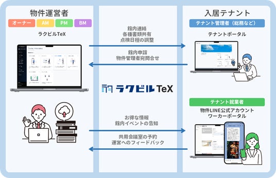 具体的には、「ラクビルTeX」は、物件運営者向けツールと、テナント向けポータルサイトやLINEアカウントなどを通じて、ビル館内の連絡、フロー管理が可能な各種館内申請の受付、就業者向け優待情報の発信といった業務を一括管理できる、ビル管理におけるコミュニケーションツールです。これにより、ビル運営者とテナント企業間のコミュニケーションや、ビル管理者間のやり取りがより円滑になり、物件管理者の業務負担を大幅に軽減することが可能となります。さらに、従来業界で十分に行われていなかった各種ビル管理業務におけるデータの適切なシステム内管理を実現することで、運営管理の属人化を防ぎ、データの利活用を促進します。