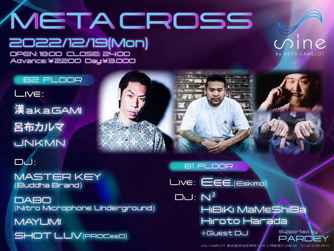 12月19日渋谷CLUB CAMELOTにて、世界初の試みとなる(*1)リアルとメタバース連動型クラブイベント「Meta Cross」を開催します。記念すべき第1回目のゲストには、呂布カルマ・漢 a.k.a.GAMI・JNKMAN・DABO(Nitro Microphone Underground)・DJ MASTER KEY(Buddha Brand)らHip-Hop界のレジェンドが集結します。