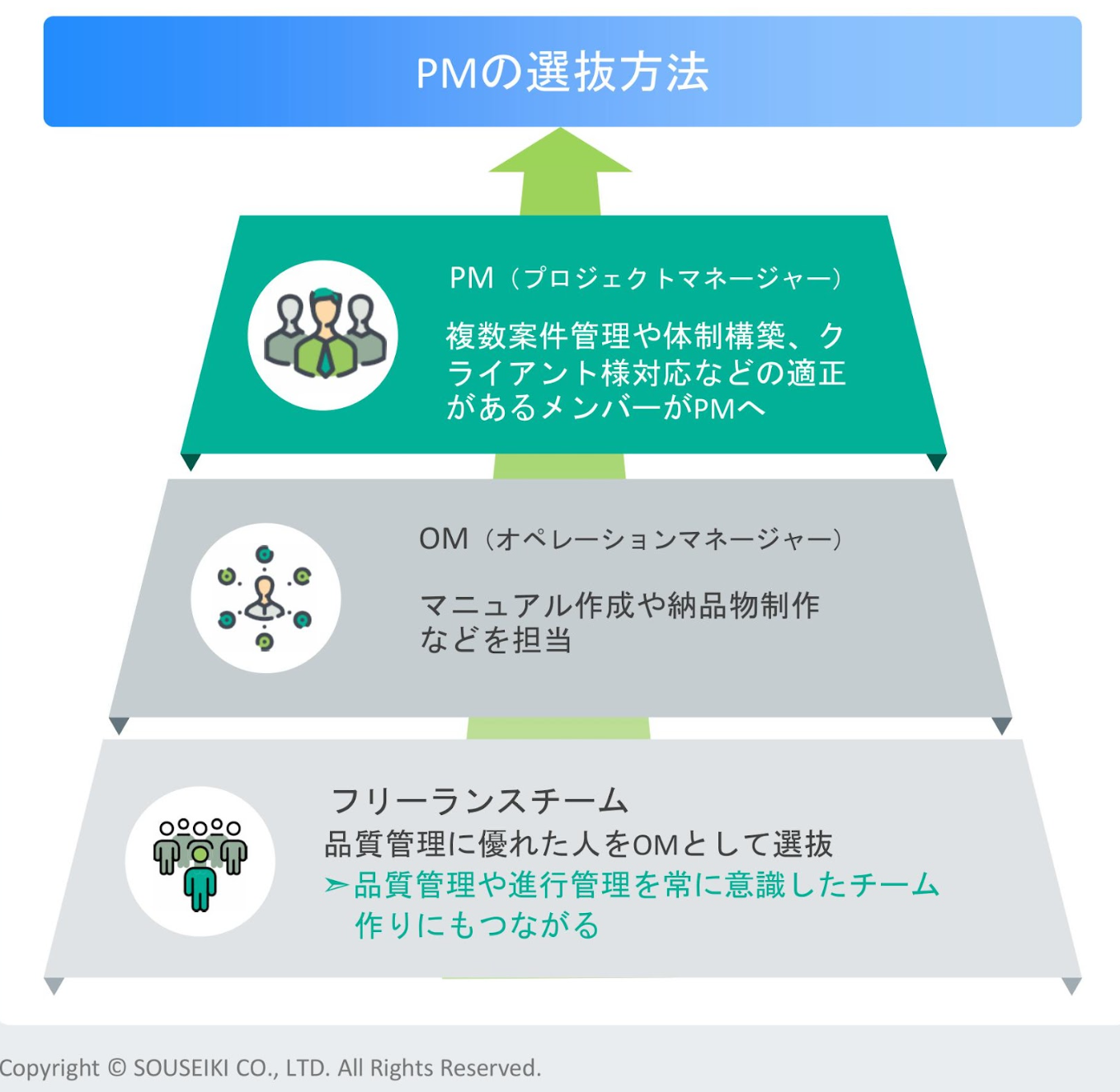 草世木は10万人以上のフリーランスプールを活用し、常にマネジメント人材を育成。PM以外にも、業務ごとにOM(オペレーションマネージャー)を配置して、業務の最適化を図っています。