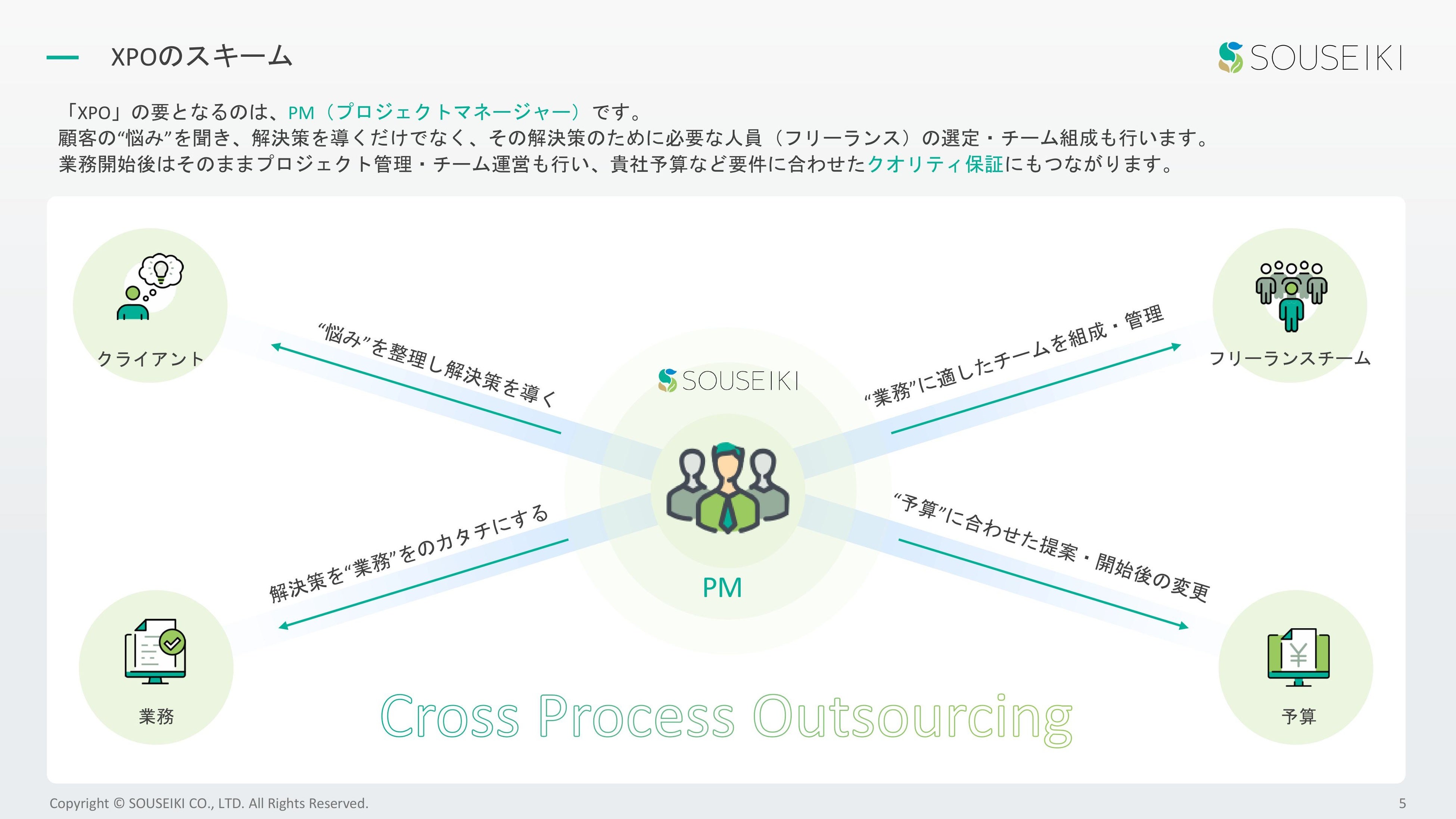 BPO、BPaaSはプロセスを効率化し、工数を削減することに重点を置いていましたが、XPOはPMが共創することで課題を解決し、新たな価値を創出するプロジェクトマネジメント型アウトソーシングです。