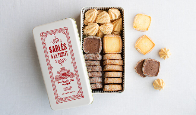 【商品詳細】メゾンブレモンド1830のエキストラバージンオリーブオイルと旨味たっぷりの白・黒トリュフカマルグソルトを贅沢に使用した極上のトリュフサブレと驚くほど軽い食感が特徴のトリュフメレンゲを、南仏プロヴァンスらしいレトロなオリジナルデザイン缶にたっぷりと詰め合わせました。