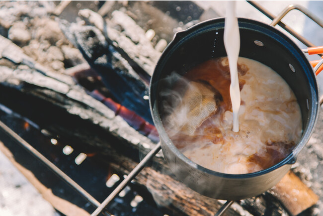 スパイスをその場で砕く、牛乳で煮出す、焚き火の香り付けは最高のスパイス。