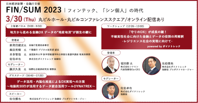 株式会社ダイナトレック(本社:東京都港区、代表取締役:佐伯 譲二、以下「ダイナトレック」)は、2023年3月28日(火)~3月31日(金)に開催される日本経済新聞社・金融庁主催の金融総合イベント「FIN/SUM 2023」にて、弊社取締役の佐伯卓也・佐伯慎也が登壇することをお知らせいたします。