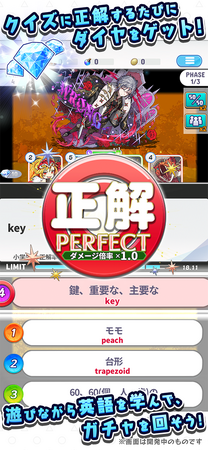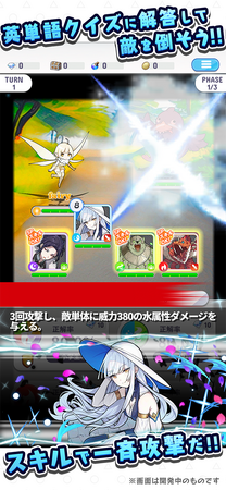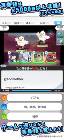 本作は「英語」と「クイズ」を掛け合わせた英語クイズRPGです。「英単語マスターになれるRPG」をコンセプトとしており、特に英単語の暗記に特化しています。英単語をもとにしたキャラクターを集めて育成しながら、クエスト内で出題される英単語クイズに正解し敵を倒し進んでいくことで、ゲームを楽しみつつしっかりと英単語が覚えられる内容となっています。英語が苦手な人、受験を控えた学生など、様々な人々に遊んでいただきたいという想いで開発しており、小学生から大人まで、幅広い年齢層の方々が無理なくしっかりと英単語を学ぶことができます。<英単語暗記に特化!>合計で約5,000語(リリース時点)の英単語を収録しており、基本的なものから応用的なものまで幅広い範囲を網羅しています。英語クイズはユーザーひとりひとりに沿った内容となることを意識しており、学生向けの問題では、学習指導要領に則り実際に学校で学ぶ単語を選び作問しているため、“本当に必要な知識”が身につきます。また、間違えたクイズがすぐに再出題される「復習機能」も備えているため、効率的に英単語を暗記することが可能です。※英単語は随時拡張予定です<小・中・高校英語&TOEICに対応した高品質なクイズ!>「中学英語」「TOEIC」など学びたいテーマにあわせてクイズを選択し遊ぶことができます。自分の学習習熟度に応じてクイズの難易度は自動調整されるため、ひとりひとりに合ったペースで学習を続けることが可能です。TOEIC is a registered trademark of Educational Testing Service (ETS). This App is not endorsed or approved by ETS.<クイズに正解する度に毎回課金通貨をプレゼント!>本作ではクイズに正解するごとに課金通貨が手に入ります。同じ問題であっても、上限を取りつくすまで何回でも獲得可能なため、繰り返しの学習につながります。また、解いた回数の少ないクイズほど課金通貨が多く手に入るため、まだ解いたことがない未知のクイズを探していく楽しみもあります。<英単語をモチーフにしたキャラクター達が登場!>本作に出てくるキャラクターはすべて英単語をもとにデザインされており、名前だけでなく、そのビジュアルにも元となる英単語の意味が反映されています。キャラクタービジュアルと共に英単語を認識することで、視覚的にも意味を捉えることができるため、文字だけで覚えようとするよりもスムーズに覚えることができます。