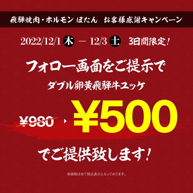 12月1日(木)~3日(土)の3日間限定で「ダブル卵黄飛騨牛ユッケ」¥980(税込)を¥500(税込)でご提供いたします。是非この機会にご来店下さい。