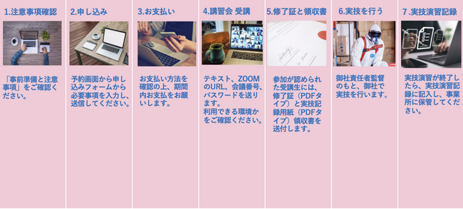 ただし、料金お支払い後にやむを得ない御事情で予定していた講習日に参加できなくなった場合、HPの下部の「お問い合わせフォーム」にて、講習日の前日までにご連絡を頂ければ、1回のみ日程変更が認められます。