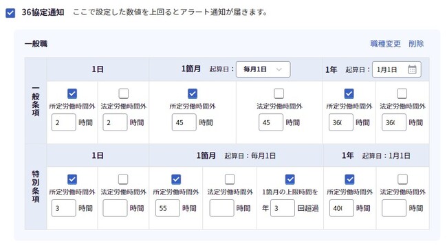 それに伴う労働法違反や余分な残業代の発生リスクなどに対応するため、36協定通知の機能を詳細に設定できるようにいたしました。