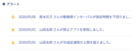 「36協定通知」「勤務間インターバル通知」「禁止アプリの使用通知」の3種類の通知があり、それぞれ違反があった場合に管理者へ通知が届きます。長時間残業やサービス残業の防止、セキュリティや作業内容の管理に役立ちます。