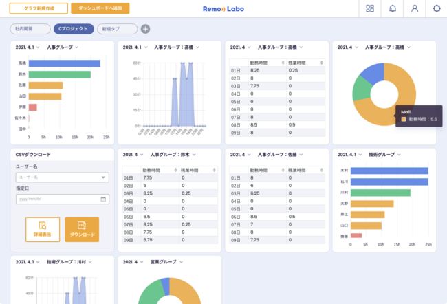誰がどんな業務を行っているのか可視化でき、それらをグラフ化することで社員の業務負担の割合も明確になるため、生産性向上に繋がります。