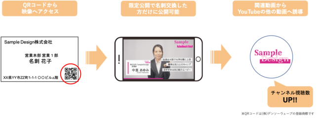 名刺に添付したQRコードを読み取って頂くことで、簡単に動画へアクセスして頂けます。