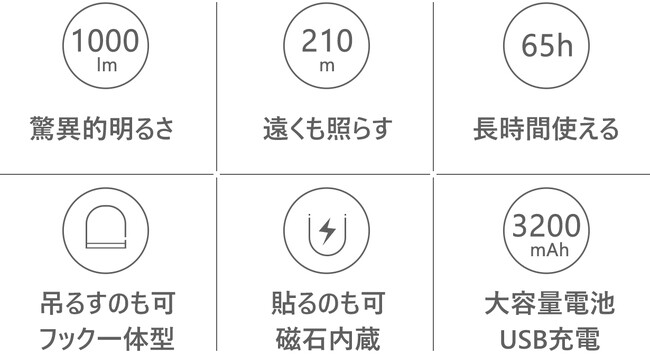 最長65時間点灯、吊るせるフックと貼り付けられるマグネット搭載