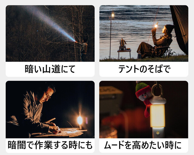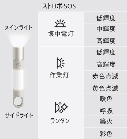 サイドライトが光る作業灯モードは4種類あり、夜の作業に役立つ上、赤色・黄色点滅で非常時にも対応可。ムードランタンモードは穏やかなひとり時間に合う光から、華やかなパーティーに合う光まで全4種から選べます。