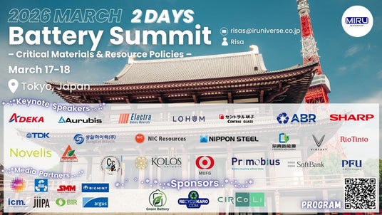 IRuniverse株式会社(本社:東京都中央区、代表取締役:棚町裕次)は、電池とクリティカルマテリアル業界に焦点を当てたセミナー「第13回 Battery Summit in TOKYO」 を2026年3月17~18日(火・水)の2日間にわたりベルサール御成門タワー(港区)で開催することをお知らせします。