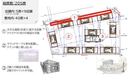 繁華街のど真ん中にオープンなスペースとして、コンテナハウス型の飲食店を誘致し、共有スペースや2階部分ではイベントの開催などを予定しております。