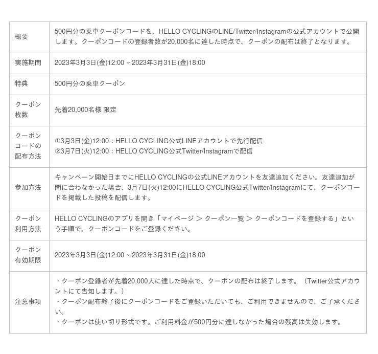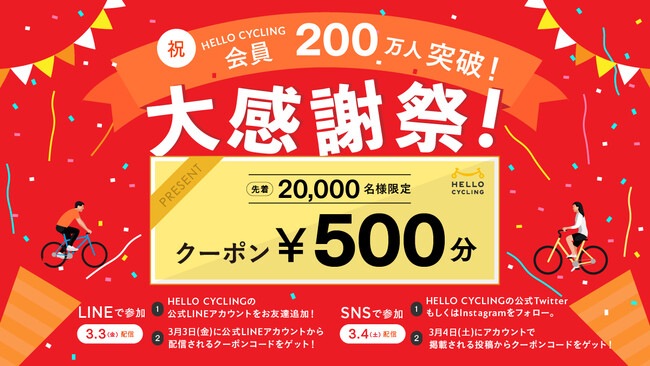 本キャンペーンは、HELLO CYCLINGの累計会員数200万人突破を記念し、日頃よりサービスをご利用いただいている皆さまに乗車クーポンをプレゼントする企画です。クーポンは先着順でのお渡しとなるため、お見逃しのないよう、皆さまからのご応募をお待ちしております。