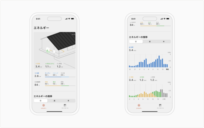 Roof-1で発電した電力に加えて、家のどこで、どれくらいの電力が使用されているかを独自のアプリで簡単に把握することが可能になりました。エネルギーの発電から消費までをワンストップで見える化することで、効果的なエネルギー利用が可能になります。
