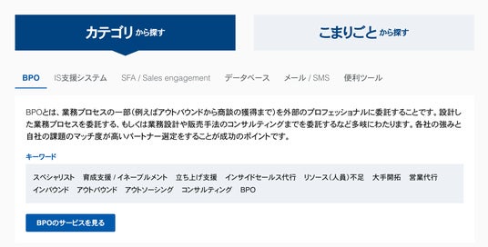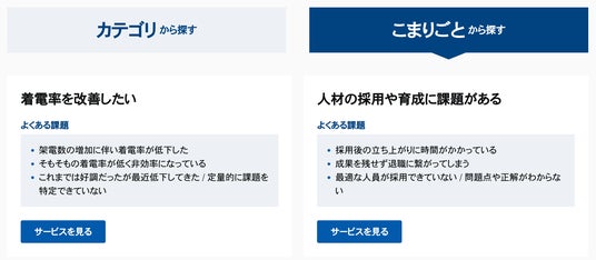 また、今回のリニューアルにて「こまりごとから探す」というページを追加しております。このページは「課題があるが解消すべきサービスが不明瞭」「自社の課題が多く、特定しきれていない」などの企業がサービスを検討するために新たに追加したものです。