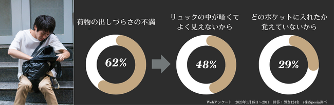 また、収納力を訴求したリュックのポケットの数は多いものの、荷物を入れた場所を覚えておらず、結局、出し入れに時間がかかるという悩みの声も聞かれました。