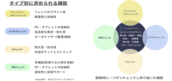 以上の背景で創りあげましたLuxphoriaのリュックを一人でも多くの方にお届けし、これまでのリュックへの不満や悩みを喜びに変えていければ幸いです。