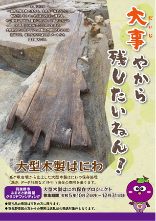 大型「木製はにわ」の保存処理に必要な資金について、ふるさと納税ポータルサイト「ふるさとチョイス」にてクラウドファンディングを実施しています。