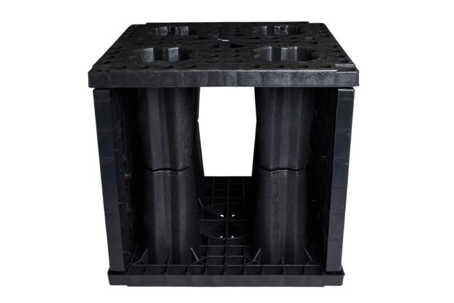 使用する部材は、最も大きいもので長さ545mm×545mm×260mm、質量は約5kgと軽量で、施工する方にも負荷がかかりません。その原材料には、シャンプーボトルやレジ袋をはじめとする容器包装リサイクル材や、洗濯機やテレビに用いられる家電プラスチック等の一般家庭から排出された廃プラスチックを再資源化したオレフィン系プラスチック(PP,PE)を使用しており、CO2削減に寄与しています。