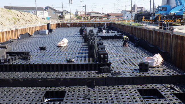 スーパージオ工法の部材を用いて構築される人工地盤は、その驚くべき強度と軽量さ、そして高い空隙性によって、不同沈下の抑制の他、地震動の軽減、液状化や豪雨被害の低減等、様々な減災効果を発揮します。