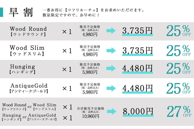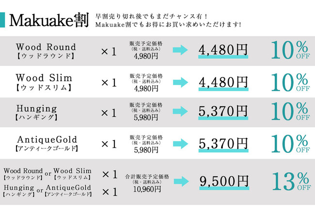 今回Makuakeにて、「早割」「マクアケ割」「セット割」をご用意しております。