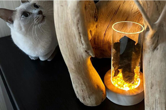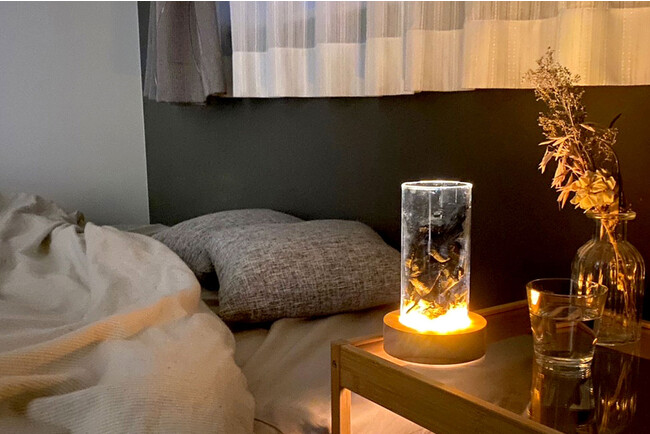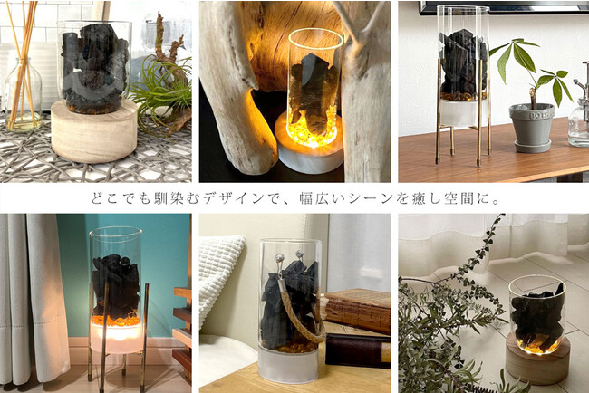 【cofuri Luce】は置くだけで優しい光が癒しの空間を作ってくれ、自然が作り出す折り重なった漆黒の色を見た目でも楽しんでいただけます。