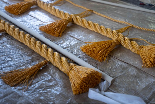 折橋商店のしめ縄は、美しい見た目にもこだわっています。しめ縄に使われるのは、私たちが黄金色と言っている繊維です。この色は、日光に当たると反射して輝くので、神社の美しさを引き立てます。また、ロープは通常3本の繊維を編み上げて作るのですが、しめ縄に使っている繊維は、編むのではなく繊維を撚ることで、より藁のしめ縄に近い見た目になるようこだわって作っています。そして、折橋商店のしめ縄が美しい最大の理由は、左右の太さが均等になっていることです。