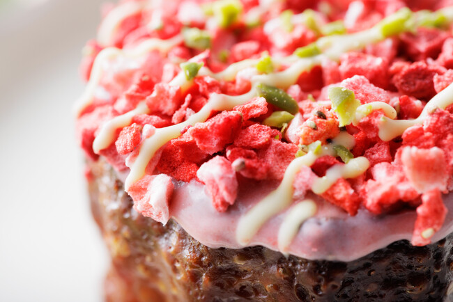 天面には、いちごチョコの上に、大量のドライいちごとピスタチオ。いちごの酸味をピスタチオのコクがまとめます。