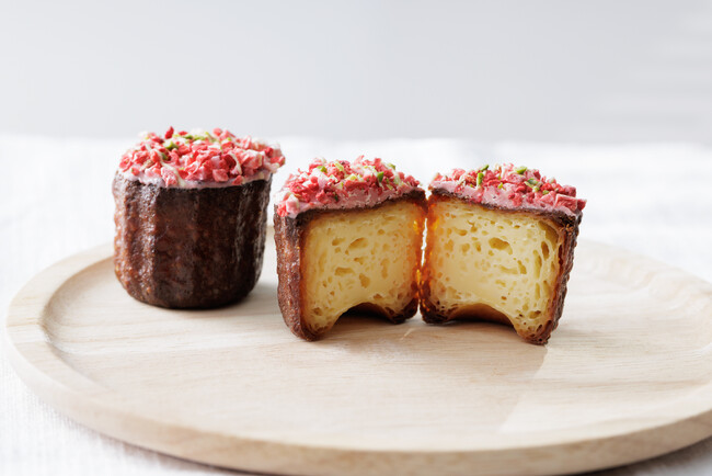 「いちごカヌレ」は、生地にもいちごチョコをたっぷりと使用。優しいいちごの甘みを感じられるカヌレ本体に、デコレーションのいちごチョコレートの甘酢っぱさや、ドライいちごのアクセントある酸味がマッチング! ドライいちごの食感やいちごチョコの濃厚な甘味、いちご風味の生地の3層の味わいが春を演出し、口の中いっぱいにいちごおいしさが広がります。