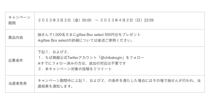 また、Twitterアカウントの開設を記念し、「ちば興銀Twitterフォロー&リツイートキャンペーン」を実施いたします。当行Twitterアカウントをフォローのうえ、指定の投稿をリツイートいただいた方の中から、抽せんで1,000名さまにgiftee Box select 500円分をプレゼントいたします。