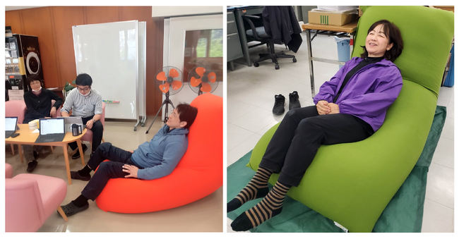 大阪市立新巽中学校では、不登校傾向の生徒が利用している校内教育支援センター(スペシャルサポートルーム)に設置。生徒さんが学習の合間の休憩中にYogiboにドサッとダイブしているそうです。 様子を見にきた校長先生も、Yogiboにダイブしていったとか。まずは教職員が試用してみる、という学校も多く、職員室や休憩室への設置、教員のミーティング中の利用なども行われています。
