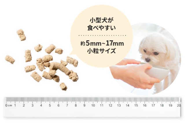 バディバディの粒は、一粒一粒、形や大きさが異なっています。不揃いにすることで、愛犬の咀嚼を促し、栄養とあわせて消化しやすい設計となっています。消化不良が原因の口臭や涙やけの改善、噛む力を衰えさせない利点があります。
