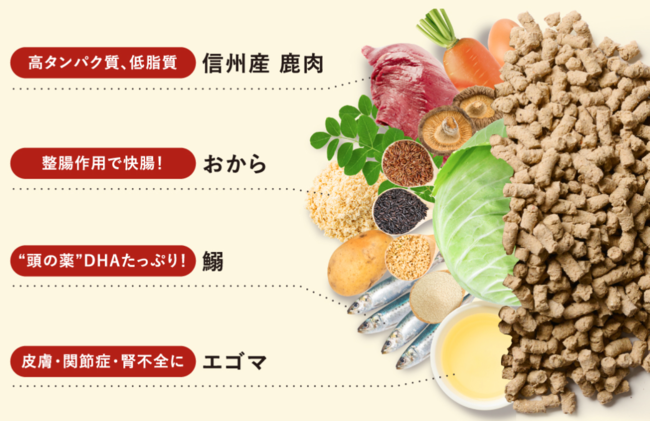 良質なたんぱく源となる鹿肉をはじめ、皮膚や関節、腎臓機能に欠かせない必須脂肪酸を含むエゴマ、食物繊維たっぷりのおからなどを使用し、食材から、さまざまな栄養が摂れるフードを作りました。原材料名は100%開示しています。