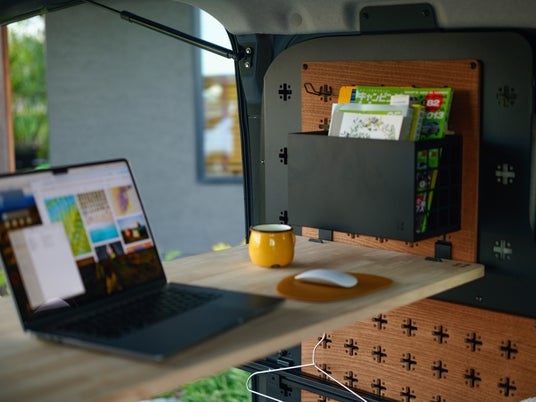 ガジェットをミリ単位で配置し、車内を即席オフィスに。
